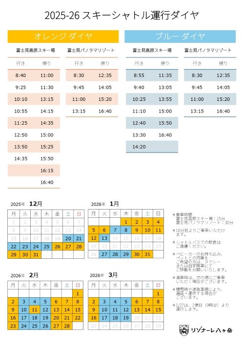 ※12月20日~12月24日は富士見高原スキー場がOPEN前のため、スキーシャトルバスは運休いたします。